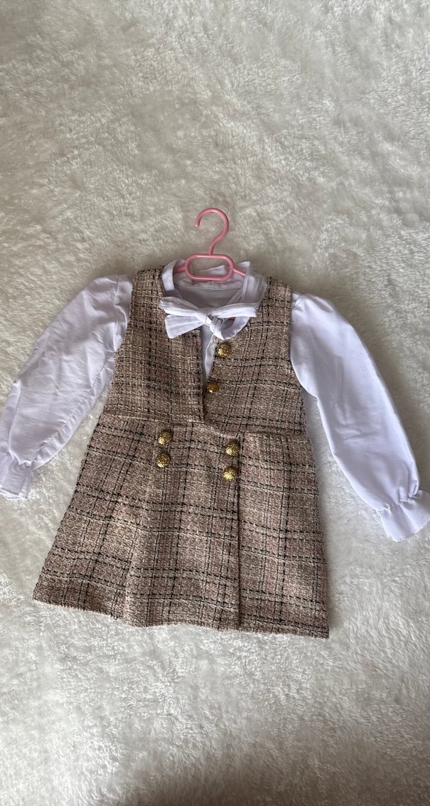 Kız çocuklar için düğmeli ve yakalı, kahverengi pastel tonlarda, modern klasik tarzda, sentetik kumaştan yapılmış kolsuz elbise.