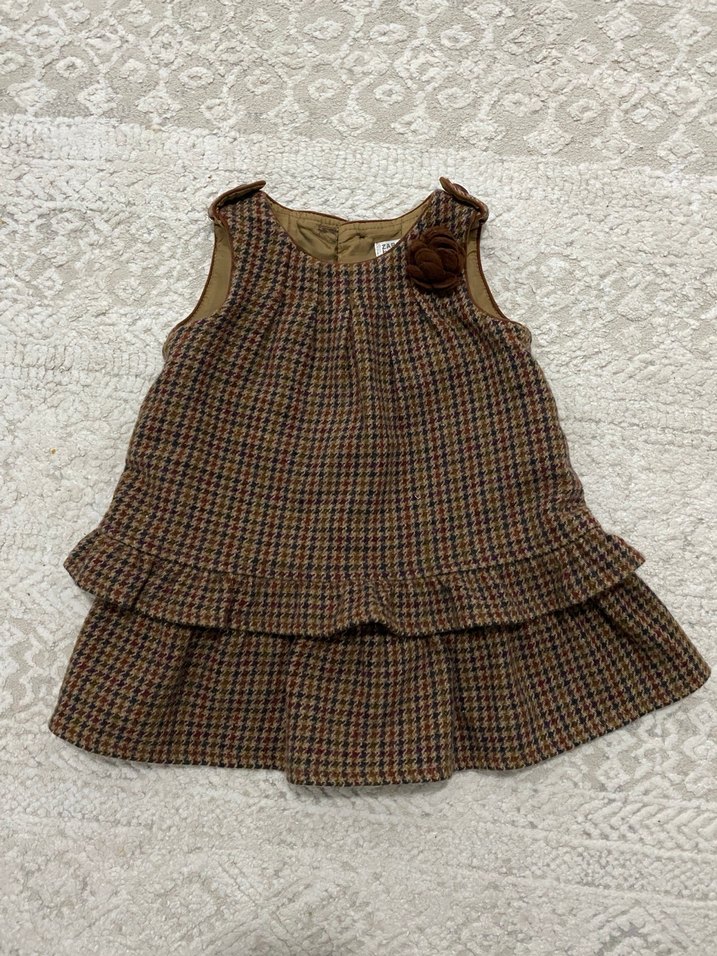 Kahverengi yün kumaştan, kolsuz, bol kesim kız çocuk elbisesi. Yuvarlak yakalı ve fırfır detaylı, klasik desenli.