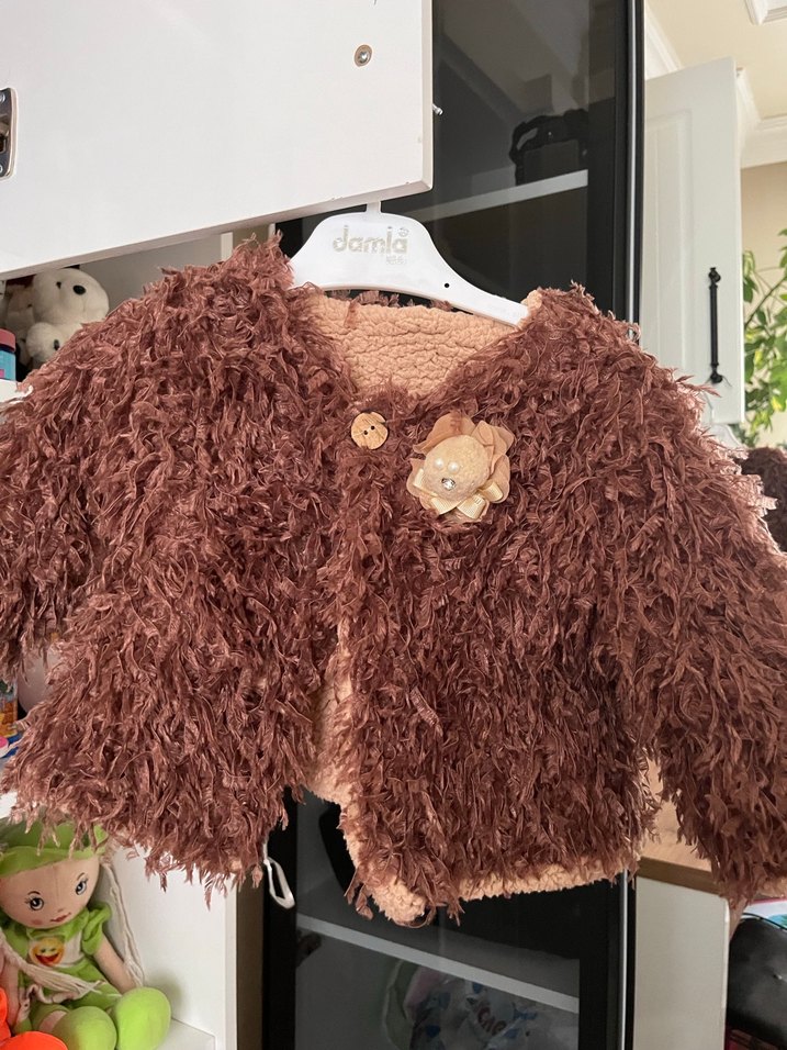 Kahverengi, uzun kollu, bol kesim ve kürk detaylı kız çocuk hırkası. Bohem tarzda, önünde çiçek süsü bulunur. ✨