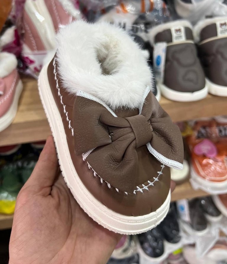 Kız çocukları için kahverengi, yumuşak kürklü astarlı ve fiyonk detaylı sıcak ayakkabı . Rahat fleece malzemeden üretilmiştir. Beden:24 35