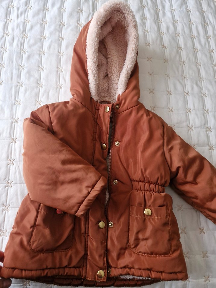 Kız çocukları için kahverengi, kapüşonlu ve içi yumuşak, sıcak kumaşla kaplı mont. Parlak görünümlü, kürk detaylı ve notched lapel yakaya sahip, dar kesim model.