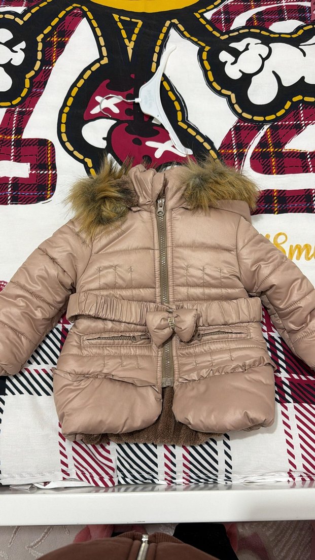 Kahverengi, kapüşonlu kız çocuk montu, kürk detaylı ve belden kemerli, yumuşak ve sıcak kumaştan, günlük sokak giyimi için uygun.
