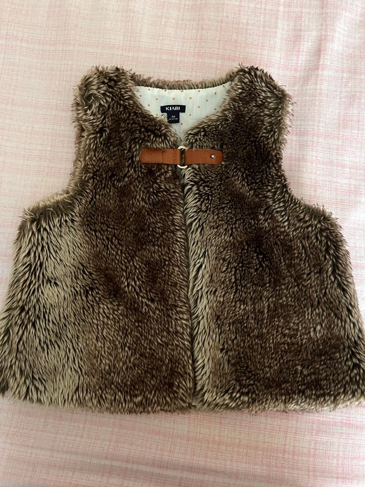 Kız çocukları için kahverengi, kürklü ve tokalı yelek. Kolsuz ve straplez, bohem tarzda rahat bir modeldir.