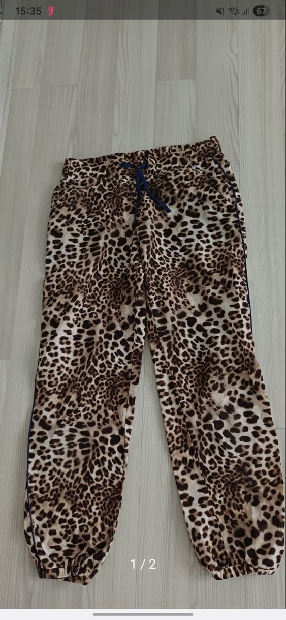 çocuklar için kahverengi leopar desenli kumaştan, bol kesim pantolon.