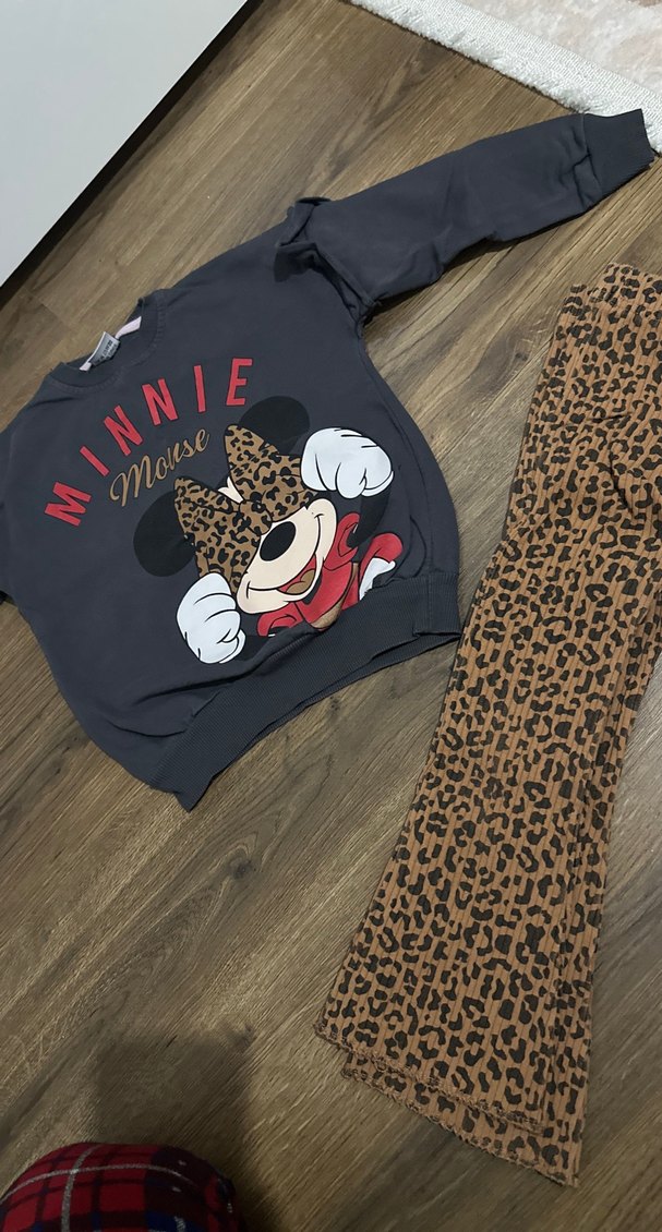 Kahverengi, leopar desenli pantolon ve Minnie Mouse baskılı, kürklü detaylı sweatshirtten oluşan bol kesim kız çocuk takımı. Sentetik kumaştan, yuvarlak yaka ve uzun kollu.