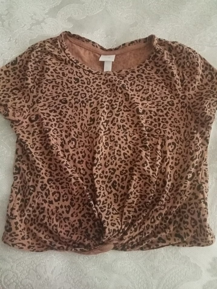 Kısa kollu, yuvarlak yaka, bol kesim kız çocuk tişörtü, koyu kahverengi leopar desenli ve drapeli, yumuşak sentetik kumaştan yapılmıştır.