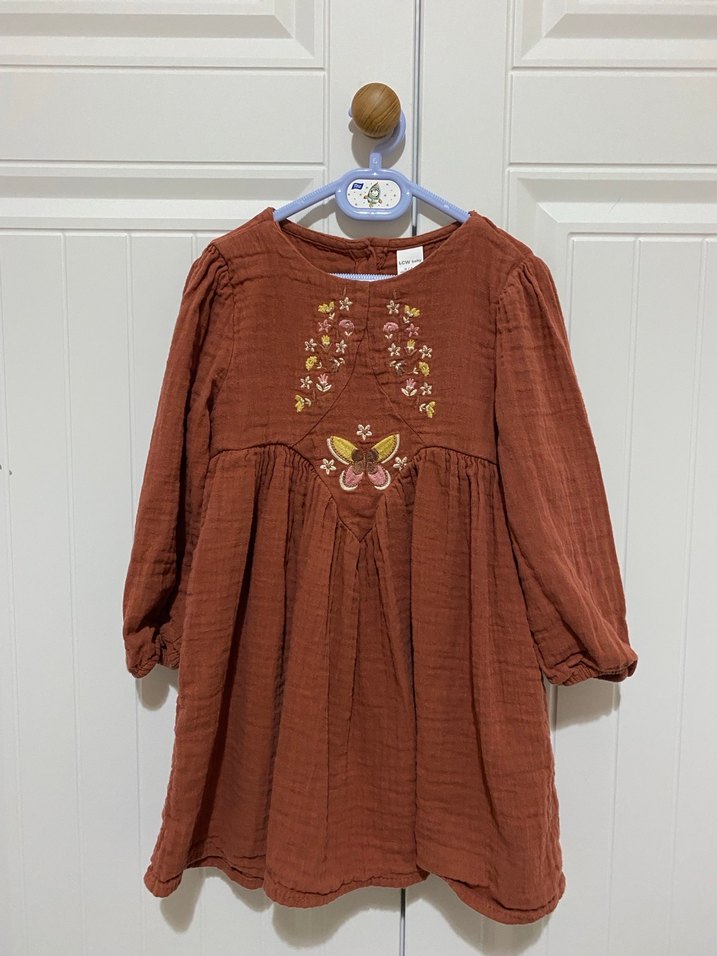 Kahverengi kız çocuk elbisesi, uzun kollu, pileli ve bol kesimdir. Ön kısmında nakışlı çiçek detayları bulunur. Yumuşak keten kumaştan, bohem tarzda ve yuvarlak yakalıdır.