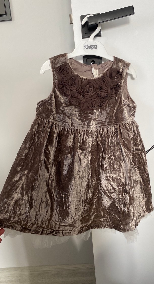 Kahverengi kadife kumaştan yapılmış, nakışlı çiçek detaylı, kolsuz ve straplez tarzda, fitted kesim kız çocuk elbisesi. Gotik esintili ve fırfır detaylıdır.