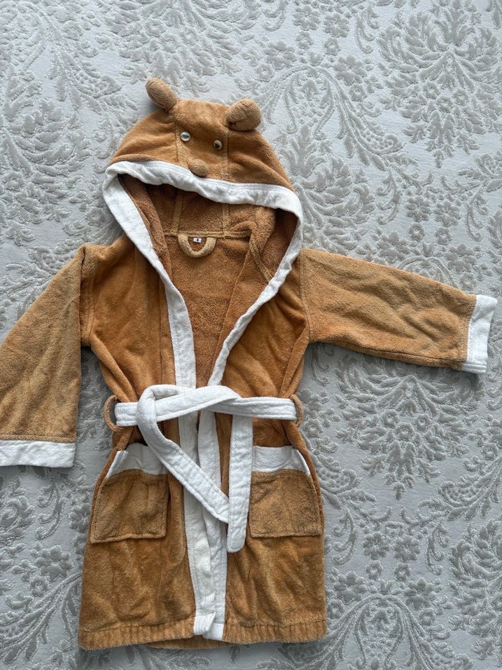 Nakış detaylı, kapüşonunda ayıcık kulakları bulunan kahverengi polar kız çocuk bornozu. Yumuşak ve rahat kumaşlı.