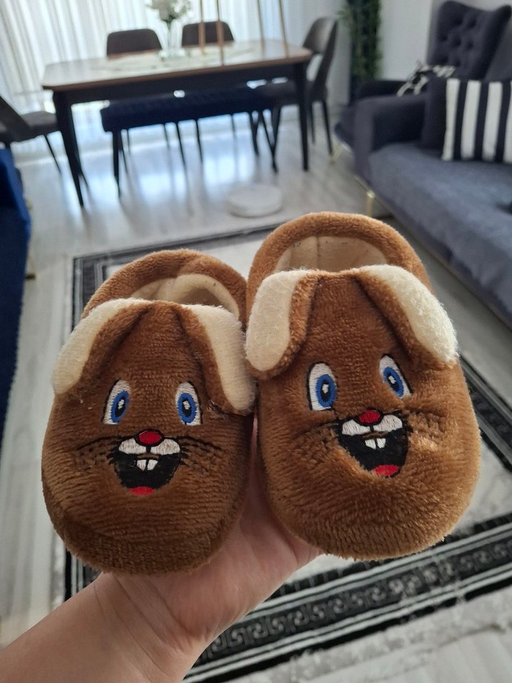 Kahverengi kız çocuk terlikleri, renkli nakışlı yüz detayları ve yumuşak kürk detayları ile sıcak ve rahat bir kumaştan üretilmiştir.