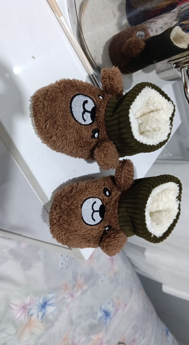 Kız çocukları için kahverengi dış yüzeyi yumuşak ve nakışlı ayıcık desenli, içi gri peluşlu sıcak terlikler.