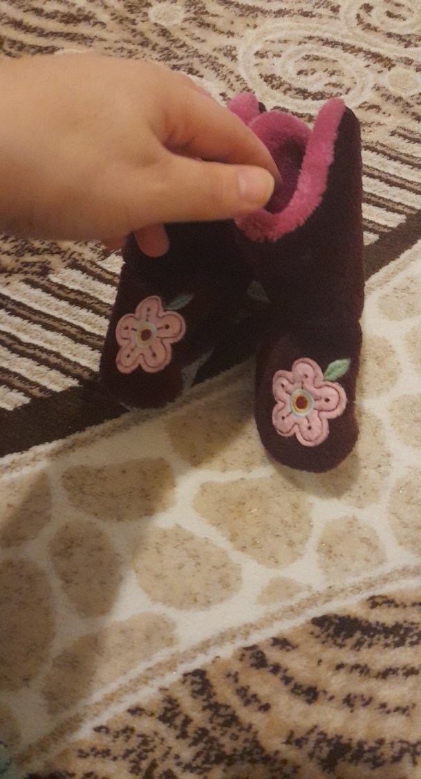 Kahverengi kız çocuk terlikleri, nakışlı çiçek desenleri ve yumuşak, sıcak iç yapıya sahiptir. Bohem tarzını yansıtan rahat bir tasarım.