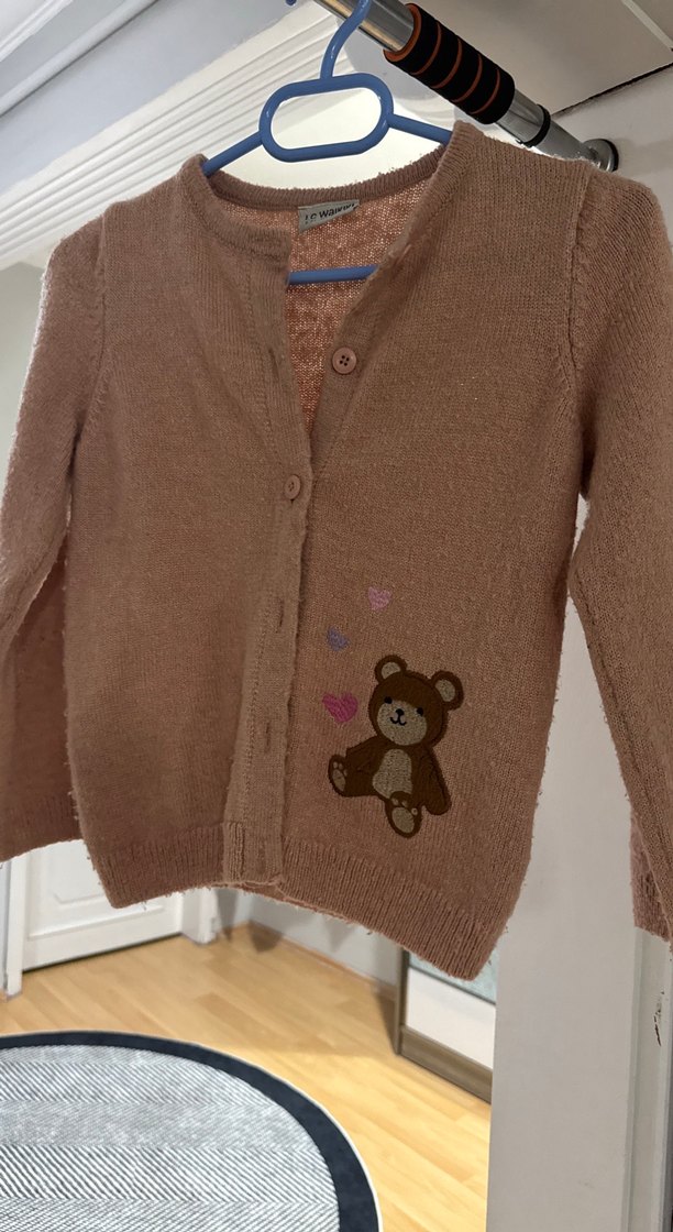 Kahverengi, uzun kollu, nakışlı ayı ve kalpler desenli, bol kesim triko kız çocuk hırkası.