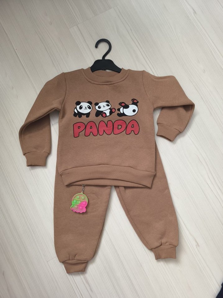 Kahverengi, yumuşak ve sıcak kumaştan, Uzun kollu, yuvarlak yakalı, renkli panda baskılı ve örme detaylıdır.