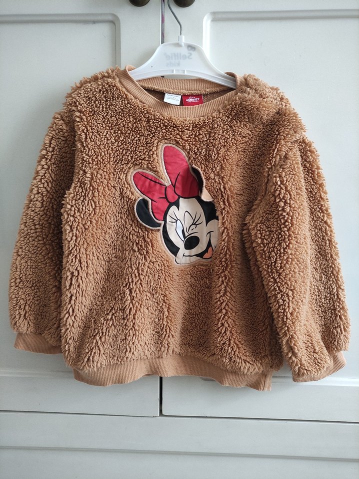 Kız çocukları için kahverengi, peluş dokulu, bol kesim sweatshirt. Uzun kollu, bisiklet yaka ve renkli nakışlı Minnie Mouse detayı bulunur.