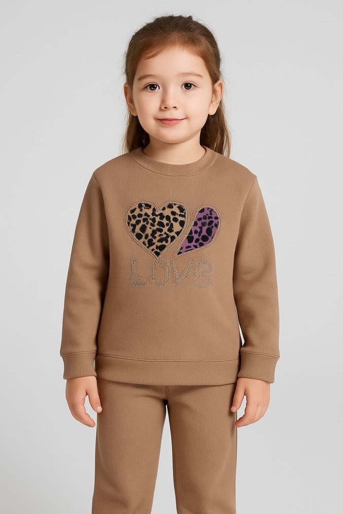 Kahverengi, uzun kollu, bisiklet yakalı ve bol kesim sweatshirt. Önünde leopar desenli kalpler ve pul işlemeli 'LOVE' yazısı bulunur, yumuşak ve sıcak kumaştan yapılmıştır.