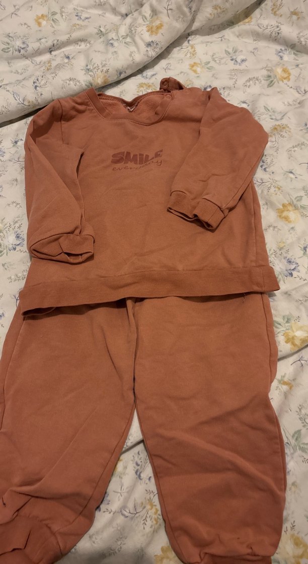 Kahverengi kız çocuk eşofman takımı, bol kesim, uzun kollu ve yuvarlak yaka. Yumuşak kumaştan rahat ve sade sokak stili, "SMIKE" logosu ile.