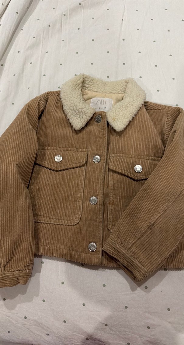 Kahverengi süet kız çocuk ceketi, yumuşak tüylü yakası ve düğmeli kapamasıyla dikkat çeker. Salaş kesim ve ön ceplidir, rahat sokak stili için uygundur.