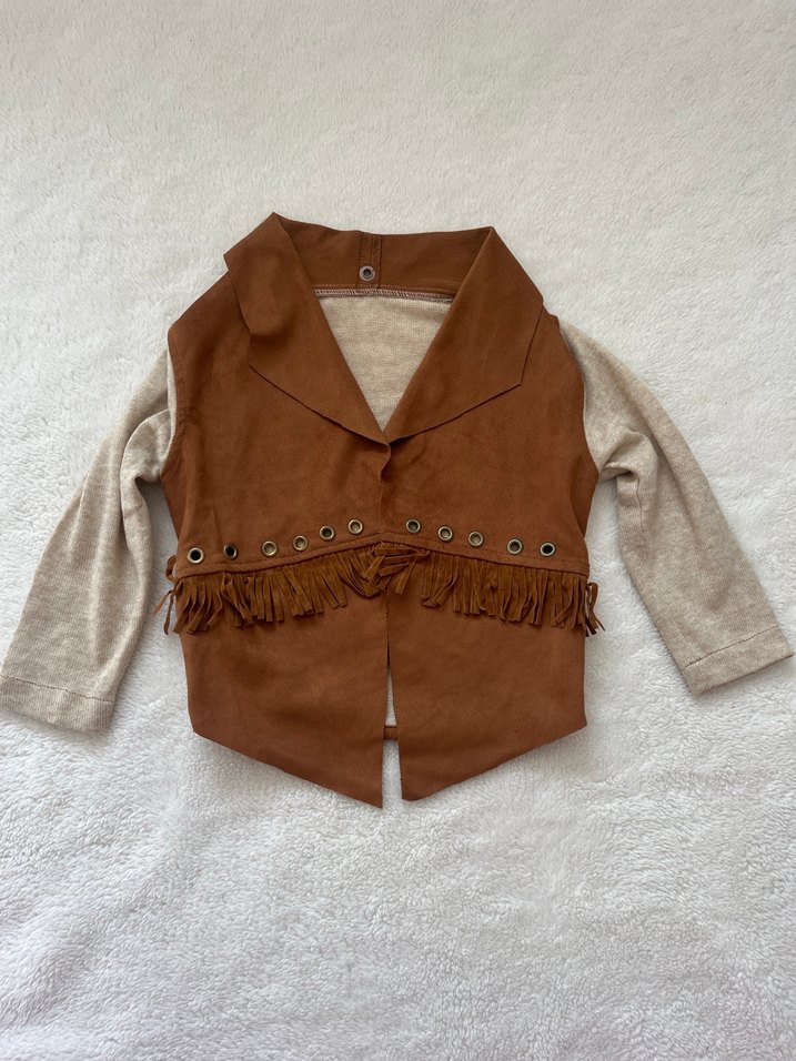 Kız çocuk kahverengi süet hırka, düğmeli, uzun kollu ve kesik yaka detaylıdır. Gevşek kesimi ve püskül detayları bohem tarzını yansıtır.