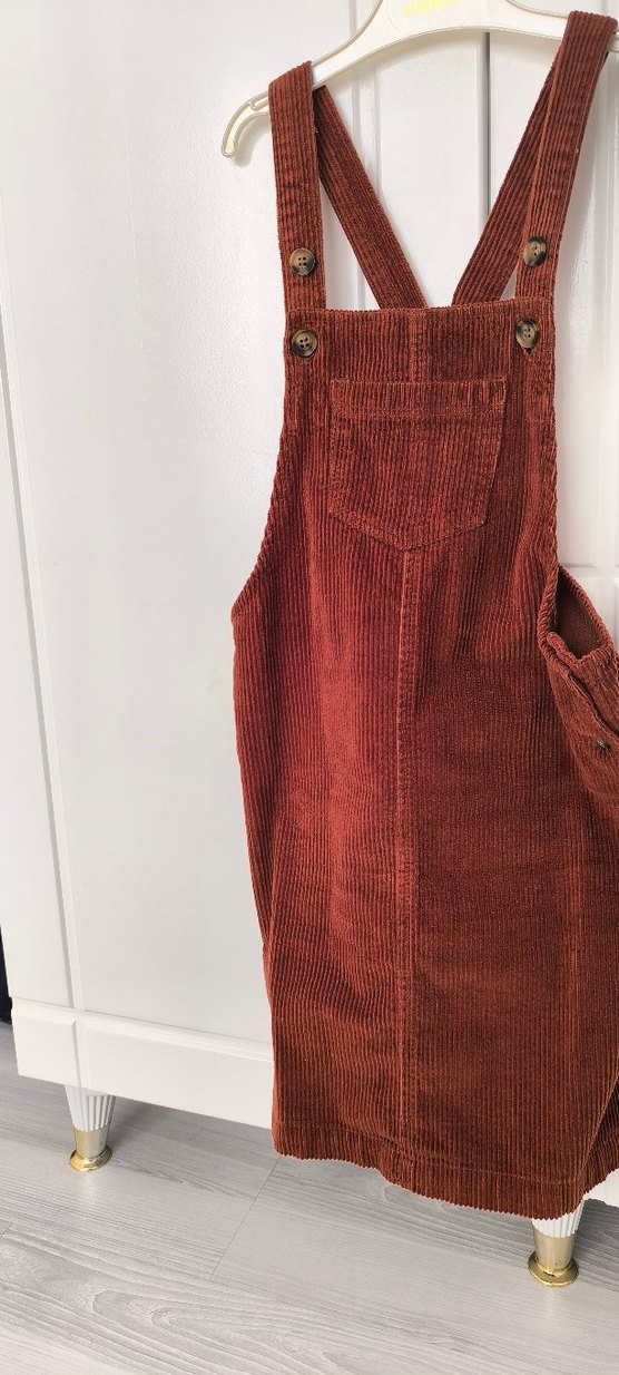 Kahverengi süet kumaştan yapılmış, düğmeli askılı ve bisiklet yakalı, bol kesim midi salopet. Rahat ve bohem tarzda, günlük kullanıma uygun. 7-8 yaşlar tercih edebilrler
