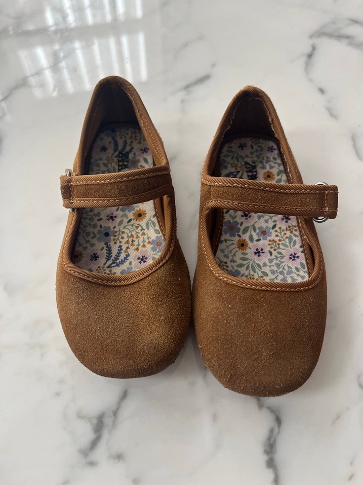 Koyu kahverengi süet kız çocuk babetleri, tokalı bant ve çiçek desenli iç astarla klasik ve bohem tarzı bir araya getirir.