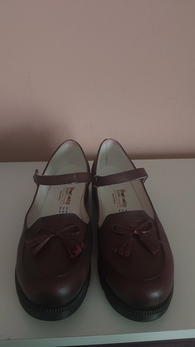 Koyu kahverengi, tokalı kayışlı ve kauçuk tabanlı kız çocuk loafer ayakkabılar. Düz ve klasik tasarım.
