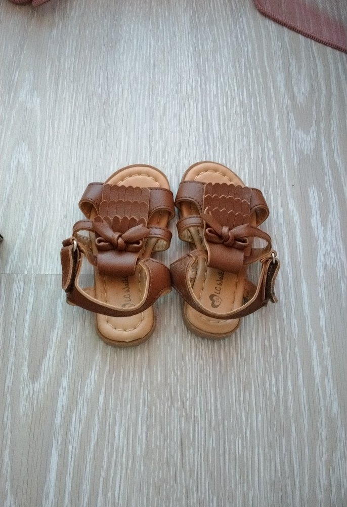 Kız çocukları için kahverengi tokalı, kauçuk tabanlı, sade bohem tarzında sandaletler. Rahat ve kullanışlı.