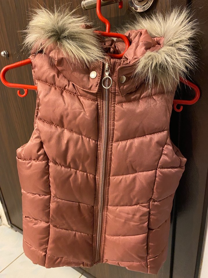 pastel tonlarında, kapüşonu takılıp çıkabilen kürk detaylı, kolsuz kız çocuk yeleği. 6-7 yaş için