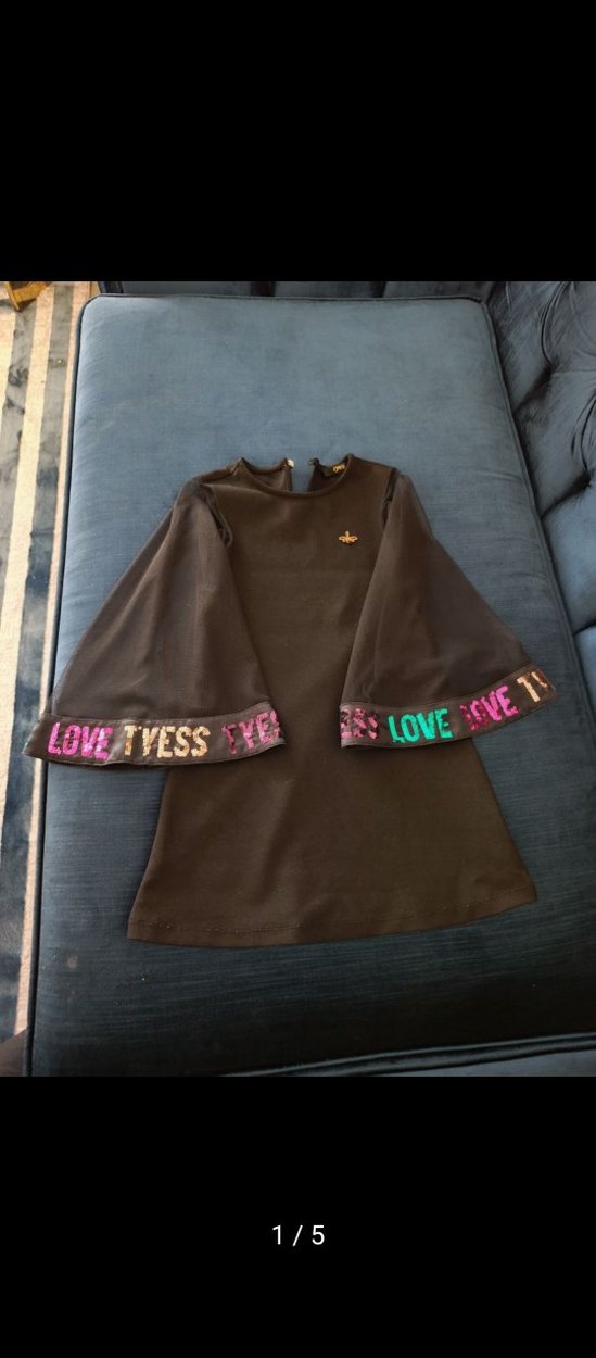 Kahverengi uzun kollu kız çocuk elbisesi, renkli baskılı manşetlere ve yuvarlak yakaya sahiptir. Rahat kesim ve velcro kapanışlıdır. Baskı: LOVETYESS TYER.