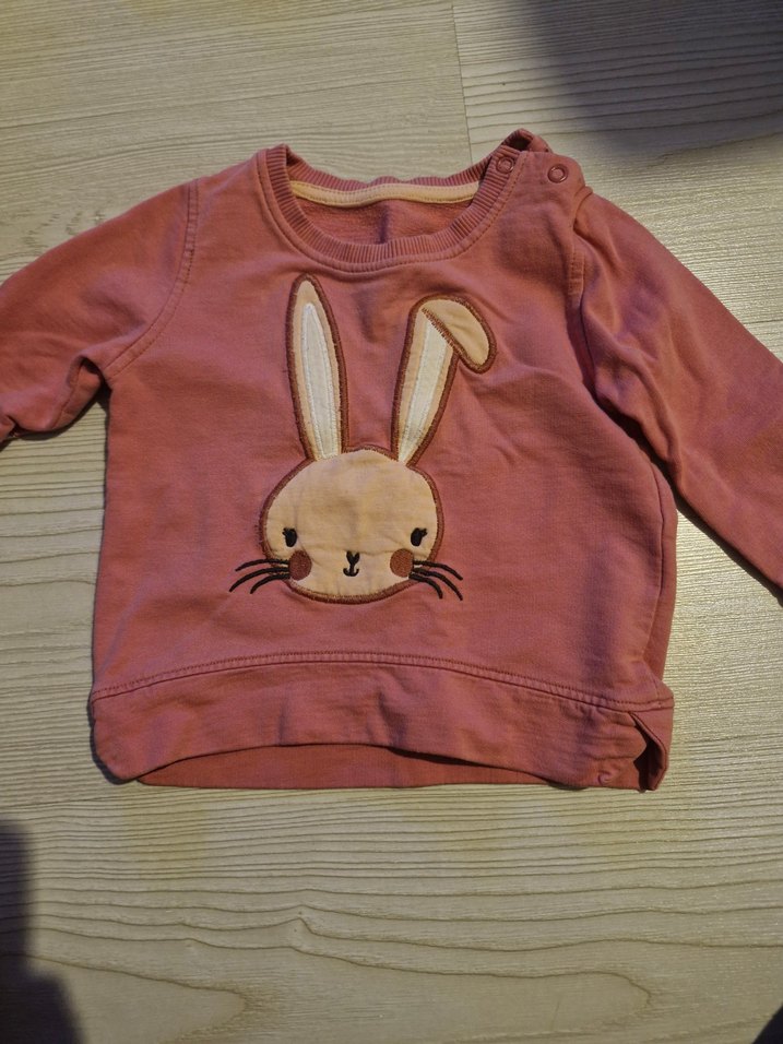 Kız çocuk pembe sweatshirt, yuvarlak yakalı ve uzun kolludur. Yumuşak kumaştan, bol kesimdir. Önünde sevimli tavşan baskısı ve omuzda düğme detayları vardır. açık pembe sweatshirt omuzdan çıtçıtlı uzun kollu. 9 aylık kullanima uygundur ikili satilmaktadir