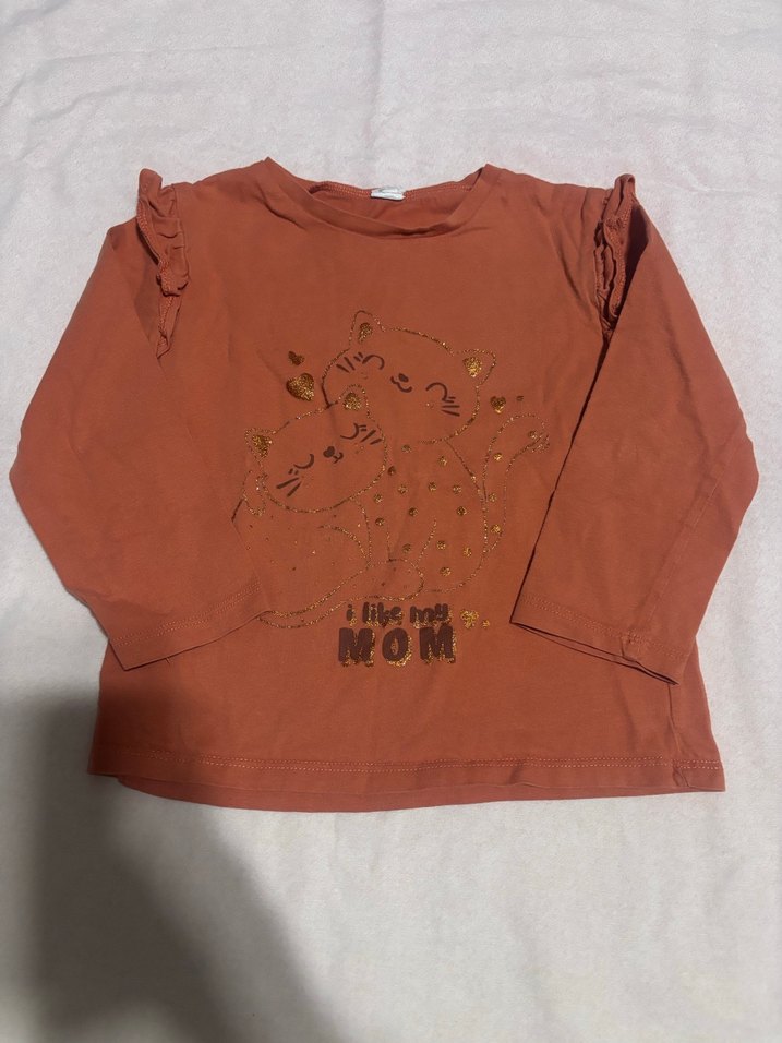 Kız çocuk kahverengi tişört, uzun kollu, bisiklet yaka ve bol kesimdir. Omuzlarda fırfır detayları ve "MOM" yazılı parlak baskı vardır. Yumuşak ve sıcak kumaştan üretilmiştir.