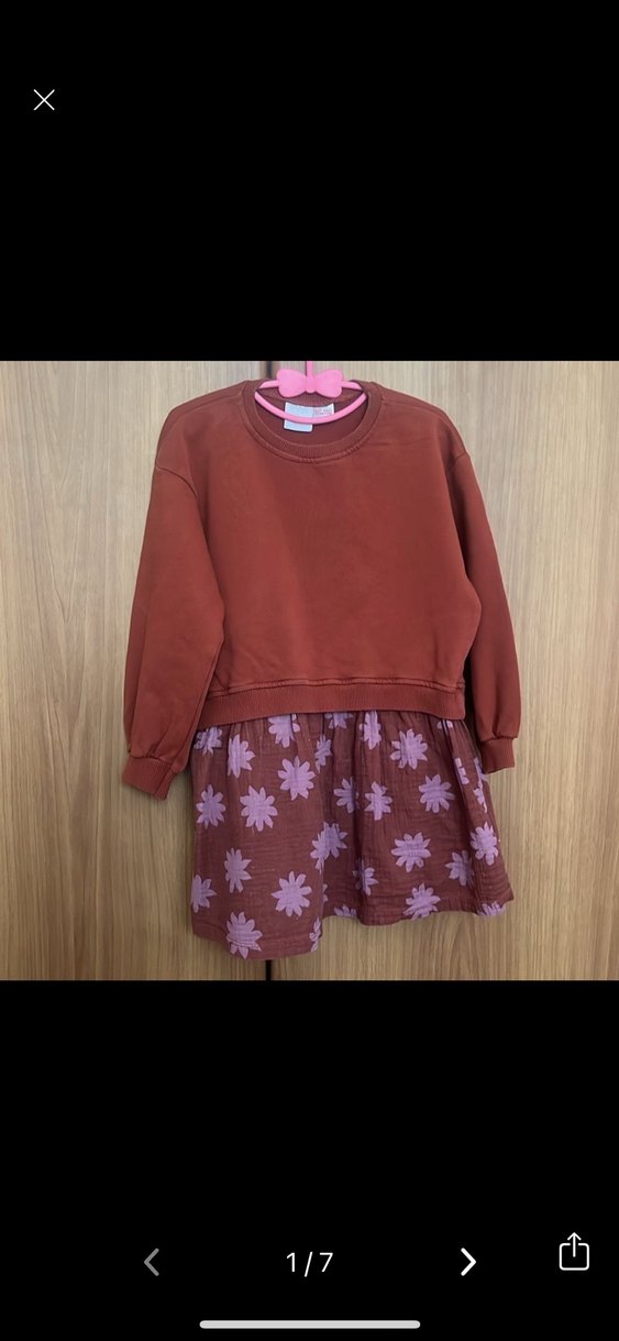Kız çocuk elbise, bol kesim, uzun kollu ve yuvarlak yakalıdır. Koyu kahverengi triko üst ve mor çiçek desenli etek rahat ve gündelik tarz sunar.