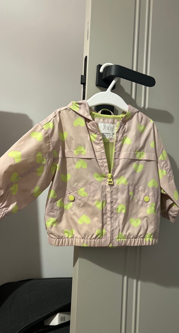 Kız çocukları için, düğmeli ve notched yakalı, kalp desenli pembe yağmurluk. Sentetik kumaştan, rahat kesimli ve günlük tarz için uygun. ️