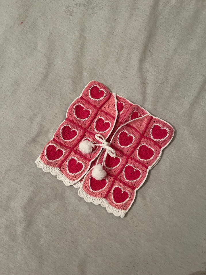 Pembe renkli, nakışlı kalp desenleriyle süslenmiş, kapüşonlu ve askılı kollu bol kesim örgü yelek.
