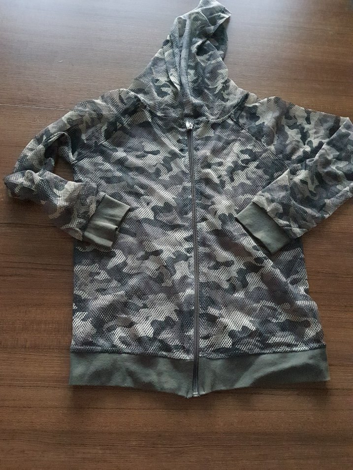 kamuflaj desenli, kapüşonlu ve fermuarlı sweatshirt. File kumaş