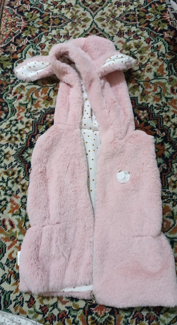 Kız çocukları için pembe, kapşonlu, kulak detaylı peluş yelek. Gevşek kesim ve altın puantiyeli nakışlı astar ile bohem, retro tarzına uygun.