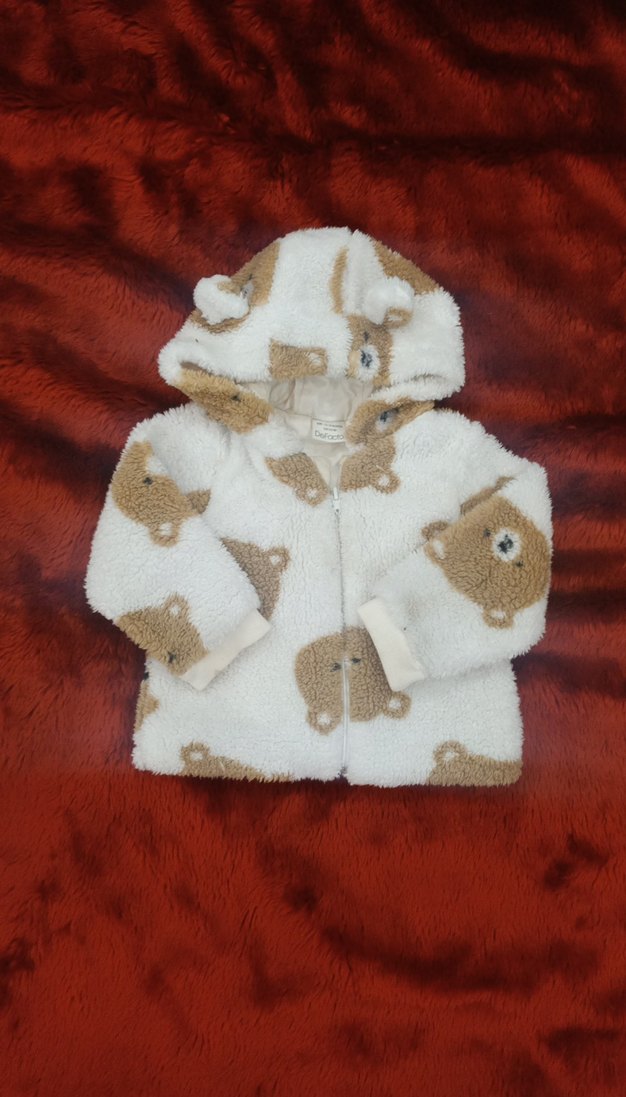 Kapüşonlu, ayıcık desenleri ve kürk detaylı, yumuşak ve sıcak kumaştan yapılmış kız çocuk montu. 12/18 ay 80/86cm