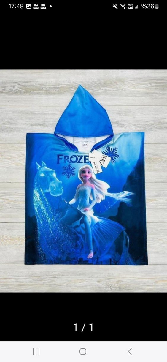 Renkli mavi, kapüşonlu ve fermuarlı kız çocuk panço. havlu kumaştan, bol kesim ve pop kültür baskılıdır.