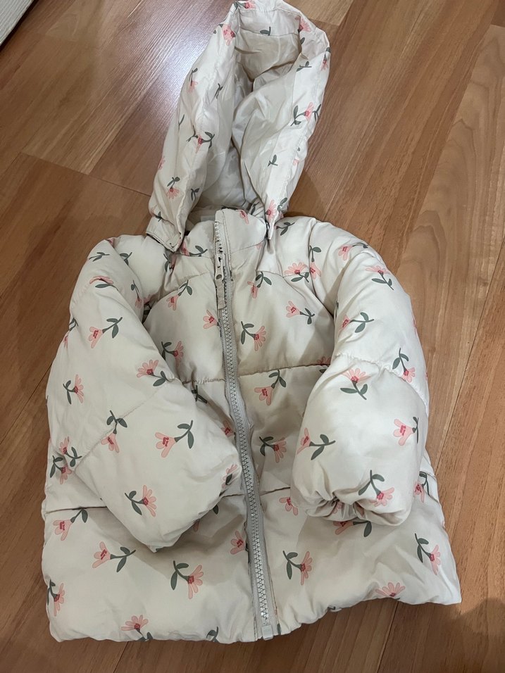 Sentetik kumaştan yapılmış, kapüşonlu ve fermuarlı kız çocuk montu. Pastel beyaz renk ve çiçek desenli, trend sokak tarzına uygun.