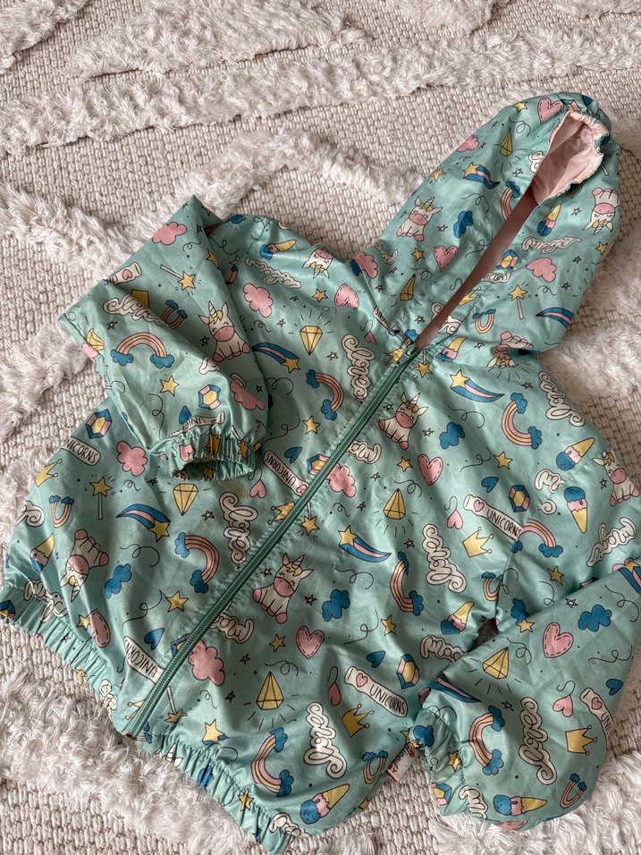 Bohem tarzı, kapüşonlu, fermuarlı, bol kesim, pastel renkli baskılı kız çocuk yağmurluğu. İçi pamuklu penye kumaş şapka ve mont içi tamamen pamukludur su geçirmez Hipoul marka tam 3 yaştır
