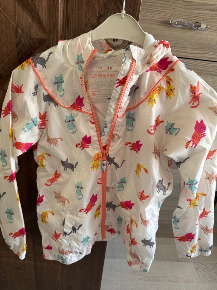 Kız çocukları için kapüşonlu, fermuarlı ve bol kesim bir yağmurluktur. Hafif sentetik kumaştan üretilmiş, beyaz zemin üzerine renkli kedi baskıları bulunur.