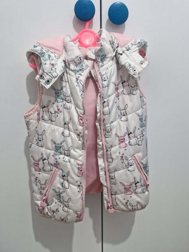 Kız çocukları için kapüşonlu, baskılı ve kürk detaylı pastel pembe yelek. Yumuşak ve sıcak kumaştan, trend sokak stili için uygun.
