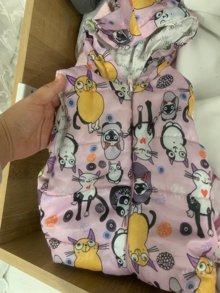 Kız çocukları için kapüşonlu, fermuarlı ve pastel renkli baskılı kedili pembe yelek. Sentetik kumaştan, fit kesim ve bisiklet yaka ile trendy casual tarzda.