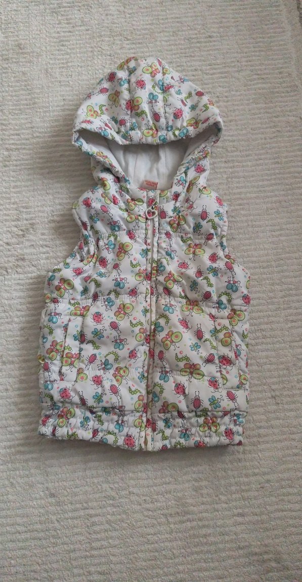 Beyaz zemin üzerine pastel baskılı, kapüşonlu, fermuarlı kız çocuk yeleği. Kolsuz, straplez yakalı ve vücuda oturan kesimde, yumuşak ve sıcak kumaştan üretilmiştir.
