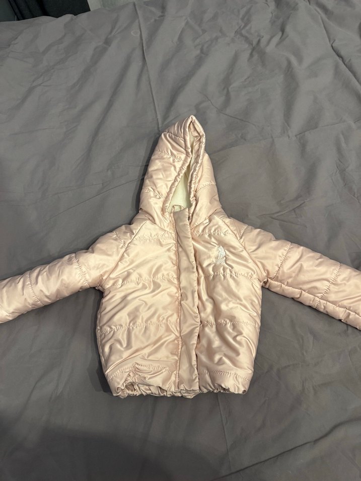 Kapüşonlu, içi polarlı ve pastel pembe renkte kız çocuk montu, rahat ve sıcak tutan sade bir tasarıma sahiptir.