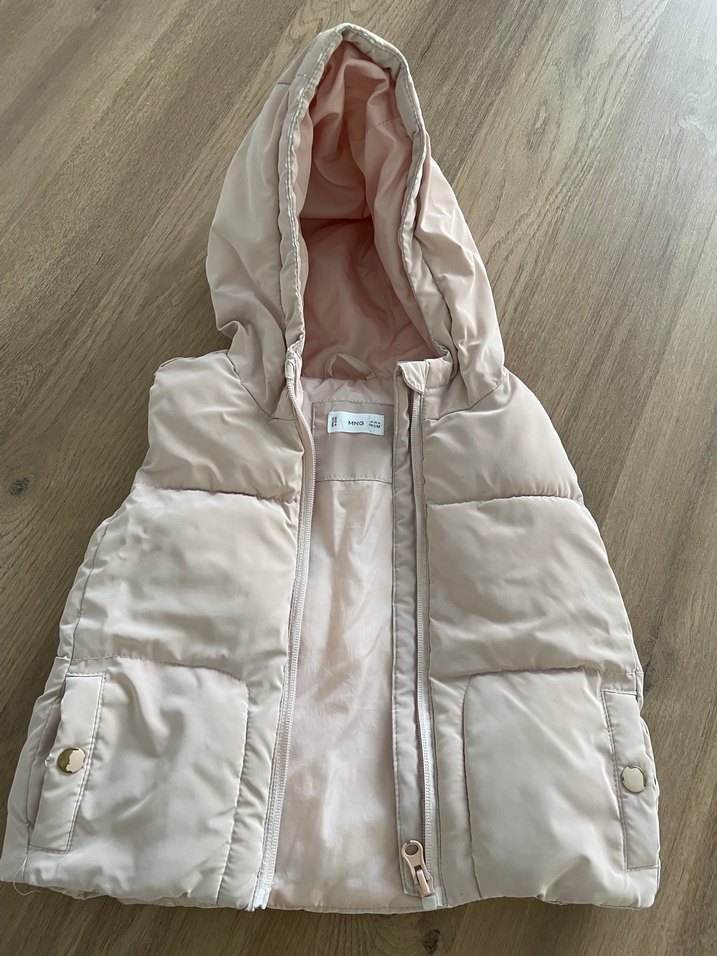 Kız çocuklarına uygun, kapüşonlu ve kürklü detaylı, pastel bej renkte, yumuşak ve sıcak kumaştan yapılmış, dar kesim bir yelektir.