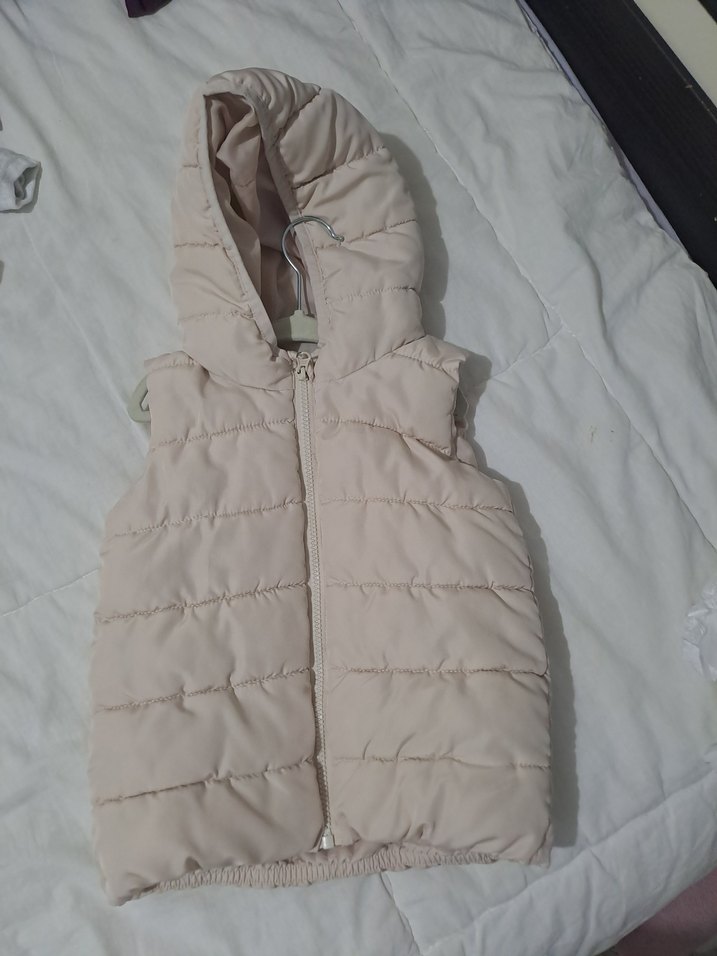 Kız çocukları için kapüşonlu, fermuarlı bej yelek.yumuşak, sıcak bir kumaştan üretilmiştir.