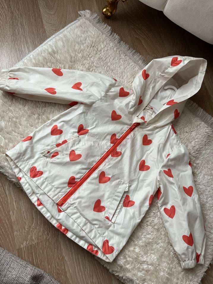 Beyaz zemin üzerine kırmızı kalp desenli, kapüşonlu ve fermuarlı kız çocuk yağmurluğu, yumuşak ve sıcak dokulu kumaştan, trend sokak stili için uygun. ☔️