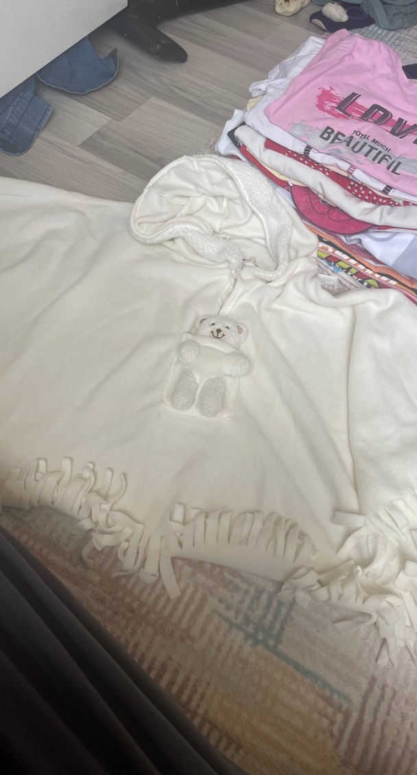 Kapüşonlu, fırfırlı ve nakışlı desenli kız çocuk ponçosu. Yumuşak ve sıcak kumaştan, bol kesim ve pastel beyaz renkte. Sevimli ayıcık aksesuarı ve püsküllü kenarları bulunur.