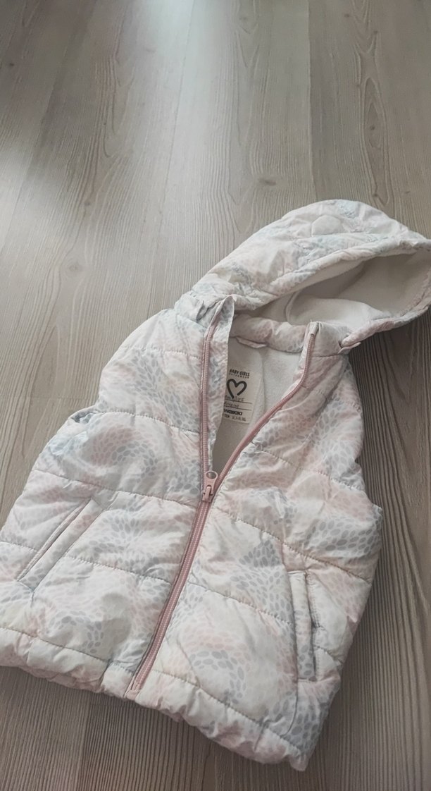 Kapüşonlu, beyaz renkli, yumuşak dokulu ve desenli kız çocuk yeleği. Fermuarlı ve cepli, dar kesimdir.